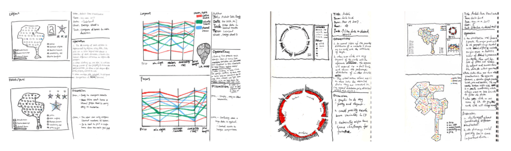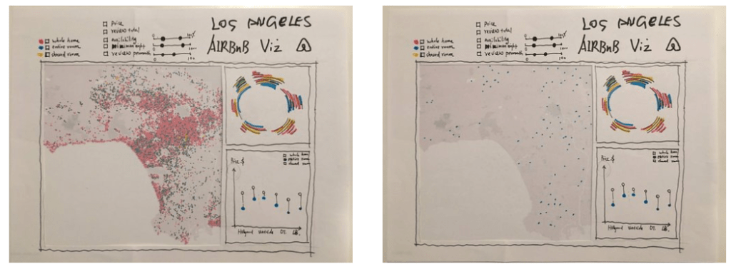The initial paper prototype concept contained a dashboard of 3 different kinds of visualizations: a map of all listings by Los Angeles neighbourhoods, a circle of the distribution of different type of room by each neighbourhood, a chart of the comparison of sale price and Airbnb price by neighbourhoods.