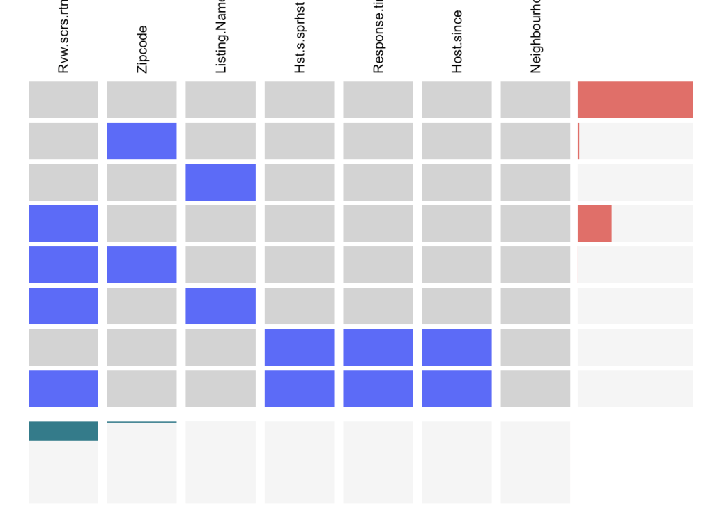 We can conclude from the above plot that the Airbnb dataset contains only a few NA values which further helps us argue that the analysis done on this data is performed without much loss of information.
