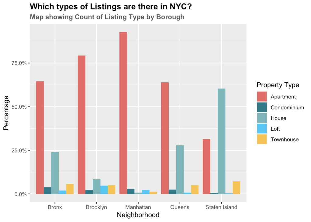 - The maximum apartment style listings are located in Manhattan, constituting 90% of all properties in that neighborhood. Next is Brooklyn with 75% Apartment style listing followed by Queens with 60% apartment style.