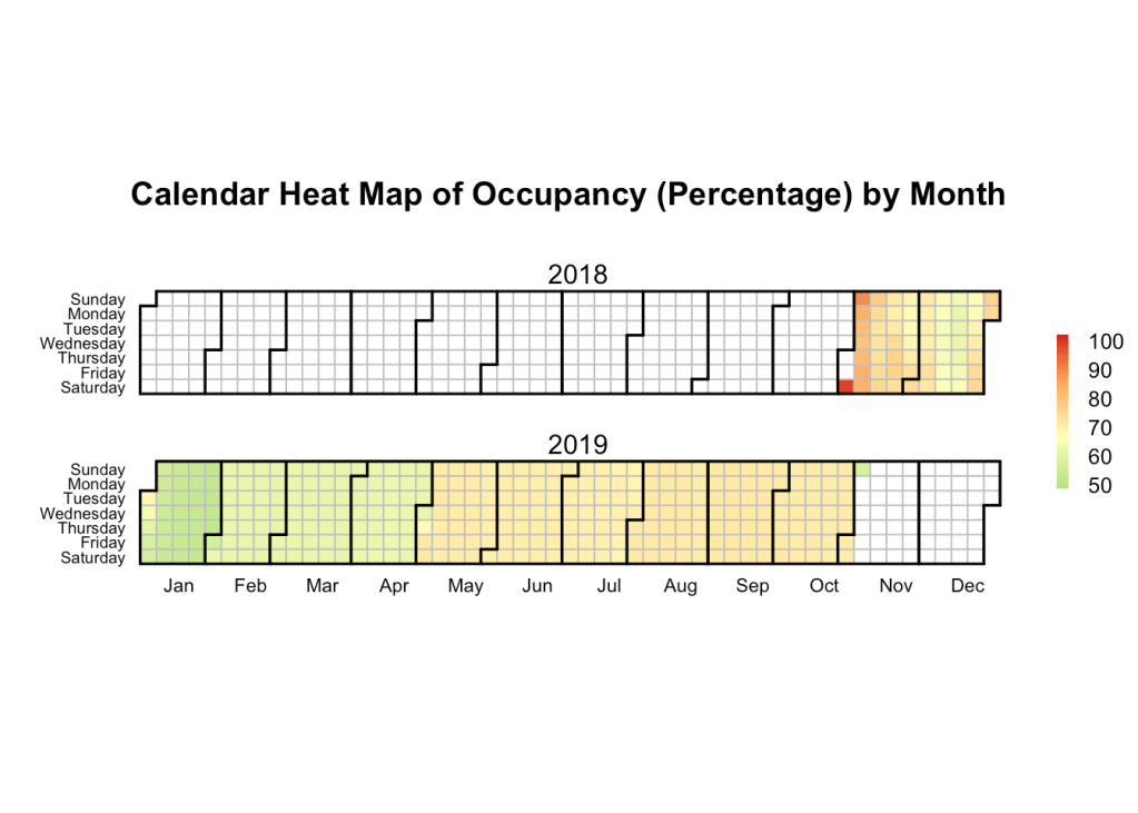 From the above calendar heatmap for 2018 – 2019, we can infer that January tends to be the quietest, and the occupancy rate increases as we progress through the year. This ties up with our results from our analysis of the number of reviews (indicative of the demand) which shows an increasing trend across the year.