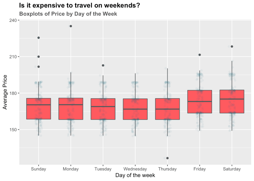 As we can see, Fridays and Saturdays are more expensive compared to the other days of the weeks, perhaps due to higher demand for lodging.