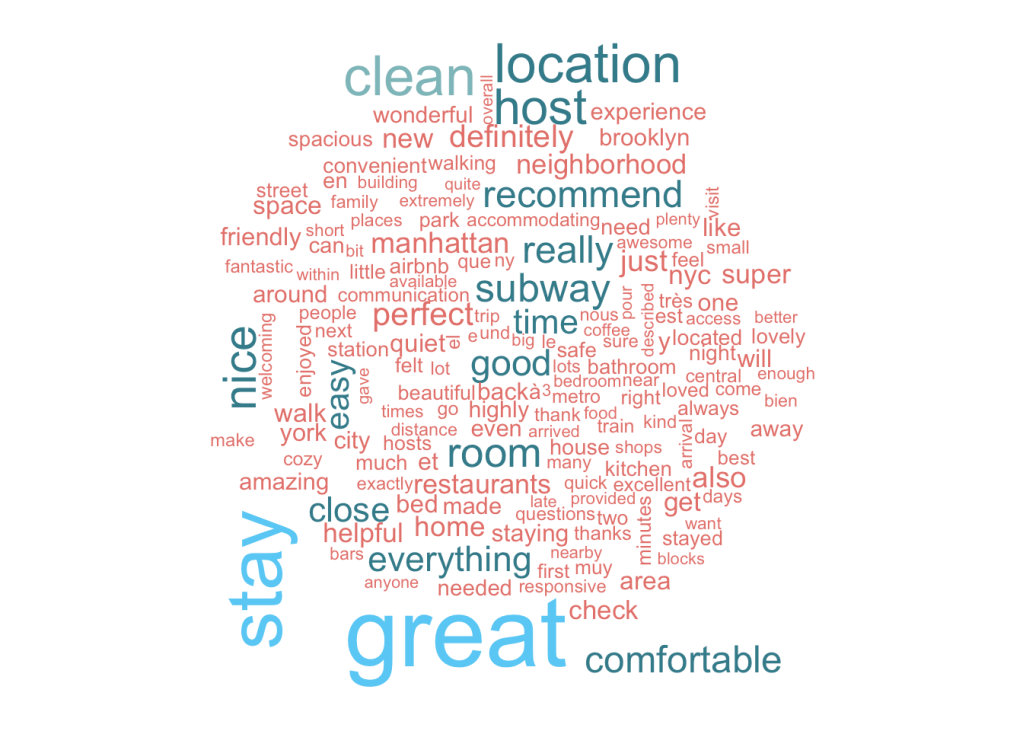 An analysis of the word cloud shows interesting trends; Location seems to be key, since the words “neighbourhood”, “location”, “area” are featured prominently in the word cloud. Transport options like “subway”, “walk” also find frequent mention. Airbnbs are short term rentals, yet people seem to lay stress on the comfort aspect of their stay, words like “kitchen” tell us that many folks would rather cook than eat out. Availability of “Restaurants” close by find mention too. Bathrooms and Beds, as expected can be clear deal breakers if not in top condition. The word “Host” finds a lot of mention; indicating the important role that hosts play in shaping the Airbnb experience.