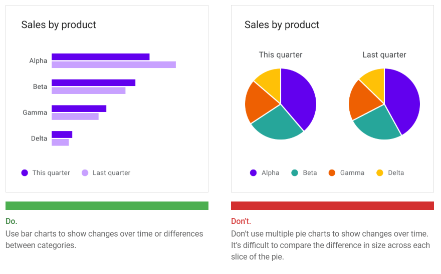 Bar charts, line charts, and stacked area charts are more effective at showing change over time than pie charts. Because all three of these charts share the same baseline of possible values, it’s easier to compare value differences based on bar length.