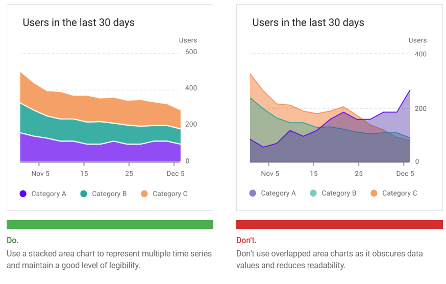 Overlapping area charts are not recommended with more than two time series, as doing so can obscure the data. Instead, use a stacked area chart to compare multiple values over a time interval (with time represented on the horizontal axis).