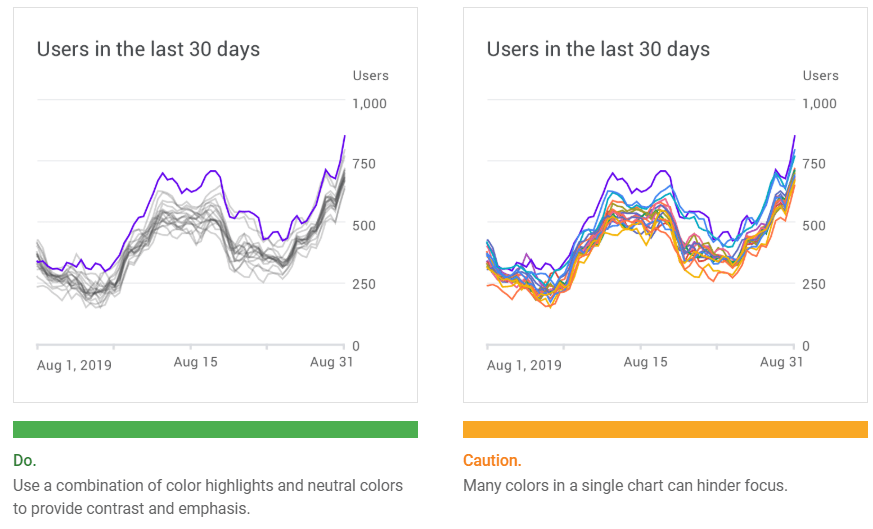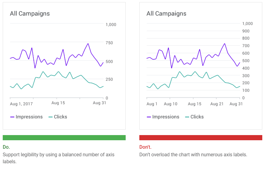 Label usage should reflect the most important data insights in a chart. Axis labels should be used as needed, and in consistent ways across a UI. Their presence should not inhibit reading the chart.