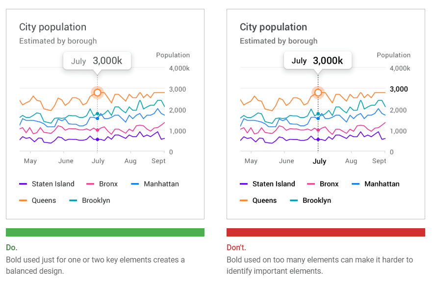 Headings and varying font weights can communicate which content is more (or less) important than other content in the hierarchy. However, these treatments should be used sparingly, with a limited number of typographic styles.