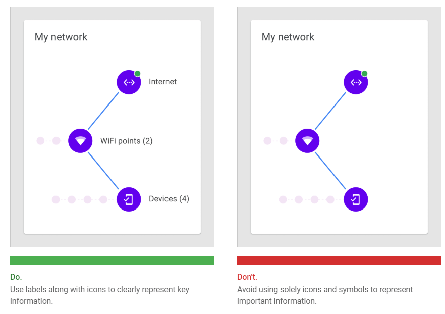 When placing icons in a chart, it’s recommended to use universally recognizable symbols, particularly when representing actions or states, such as: save, download, completed, error, and danger.