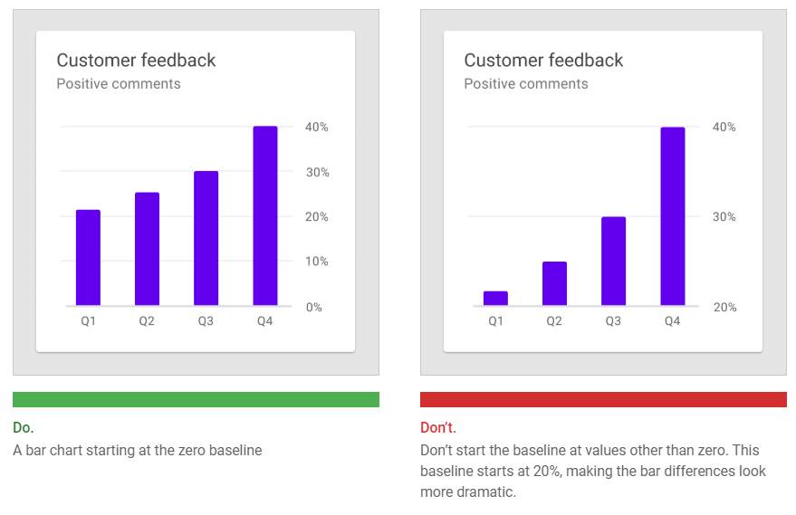 Bar charts should start at a baseline (the starting value on the y-axis) of zero. Starting at a baseline that isn’t zero can cause the data to be perceived incorrectly.