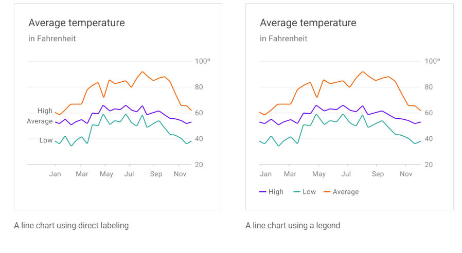 Chart elements can be labeled directly in simple charts. However, charts that are dense (or part of a larger group of charts) can display labels in a legend.