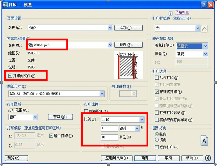 Step03:打印机名称选择“7586B.pc3”,点选“打印到文件”,选择合适图纸尺寸,调整比例,窗口选择打印部分,点“确定”打印成 plt 文件