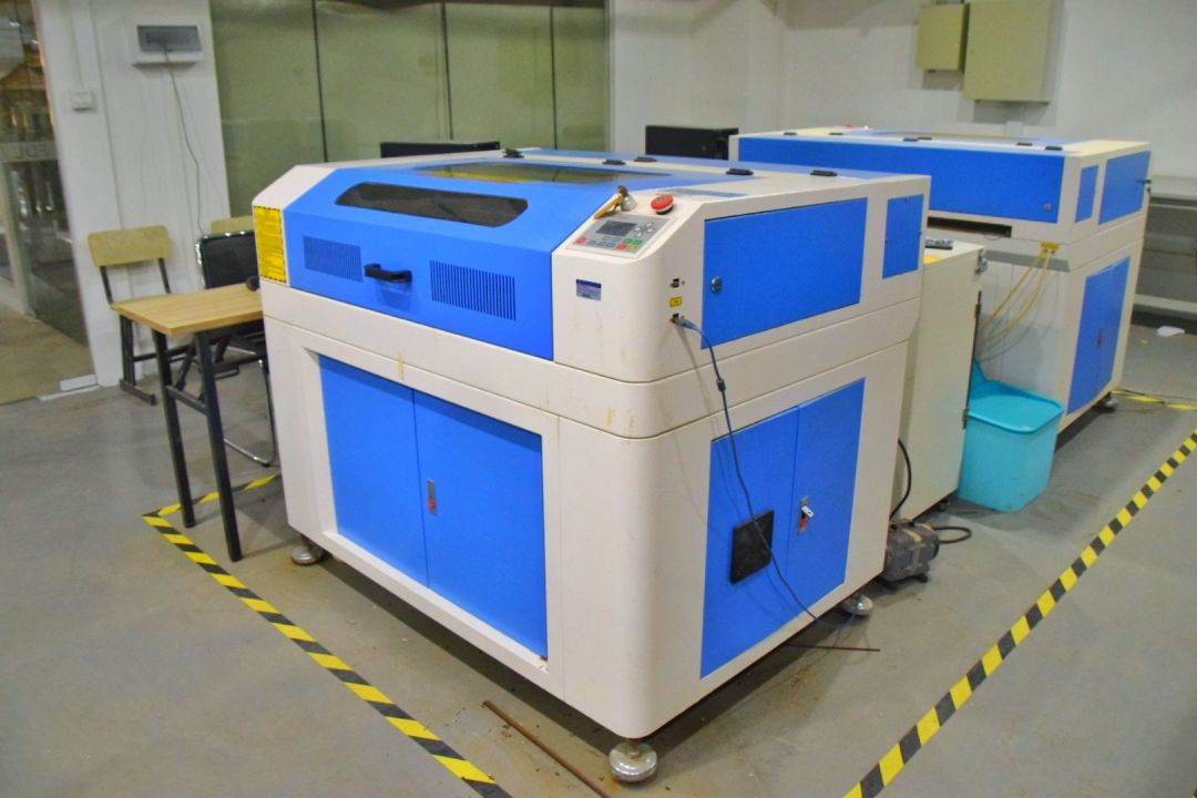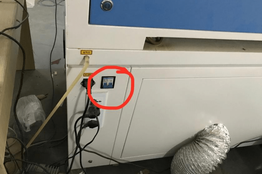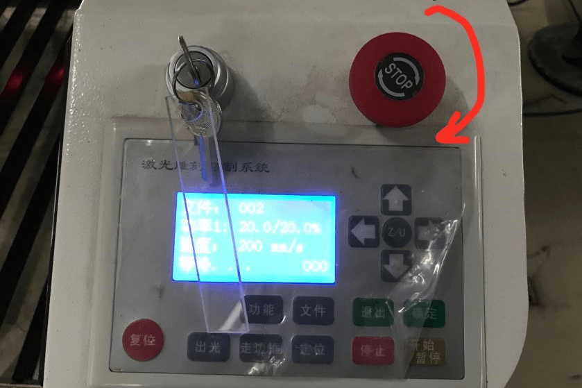 - 打开激光雕刻机。推开总开关,旋转打开雕刻机操作台的按钮。