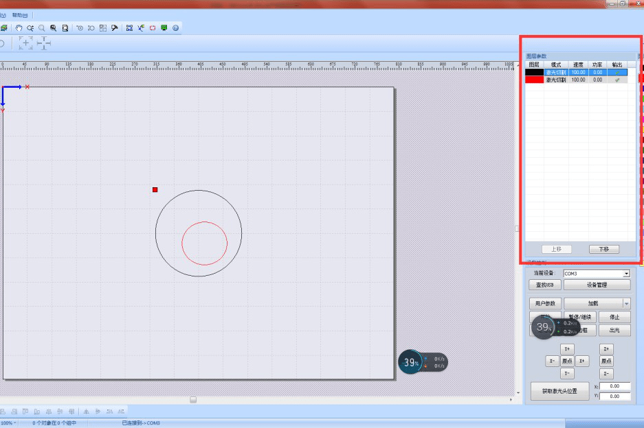 - 图纸调整无误,点击加载,载入当前文件,激光雕刻机开始运行。