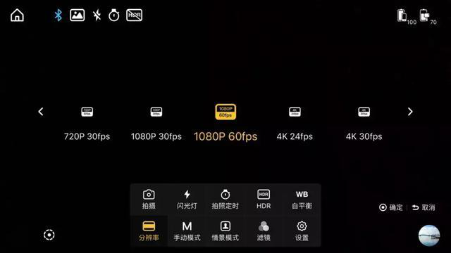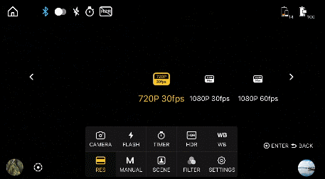 ⑦ 拨盘上键为分辨率设置快捷键,最高分辨率和帧率的选择将取决于手机性能及最大开放权限的参数,可通过单击左右拨盘键或者顺时针/逆时针旋转拨盘进行选择。