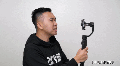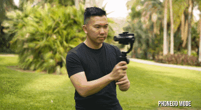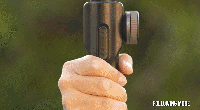 全跟随模式:按住全跟随模式键时稳定器进入全跟随模式,全跟随模式下横滚轴锁定,手机俯仰和手机水平跟随手柄转动(在拍摄由低到高或者由高到低的镜头时可使用此模式)