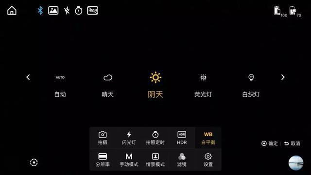 ⑤ 白平衡。在白平衡下,依次为:自动、晴天、阴天、荧光灯和白炽灯,根据拍摄情景或环境色温等拍摄需求按下拨盘中确认键即可。