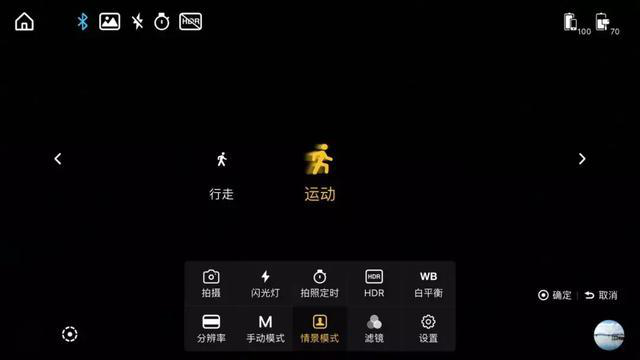 ⑧ 情景模式。在情景模式下,可选择行走或运动模式,默认为行走模式,稳定器的相应速度相对平缓。如果需要稳定器配合快速运动的响应速度,选择运动模式按下拨盘中确认键即可。
